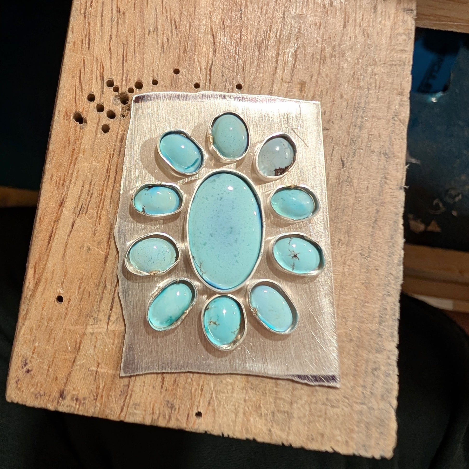 This bolo has a hefty 10 pieces of Golden Hills surrounding a larger center stone. The setting is brushed and darkened, and the bolo tips are simple and lightly darkened.